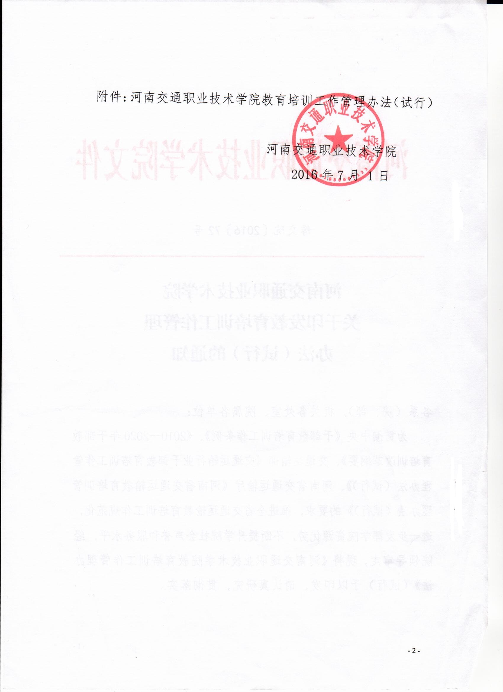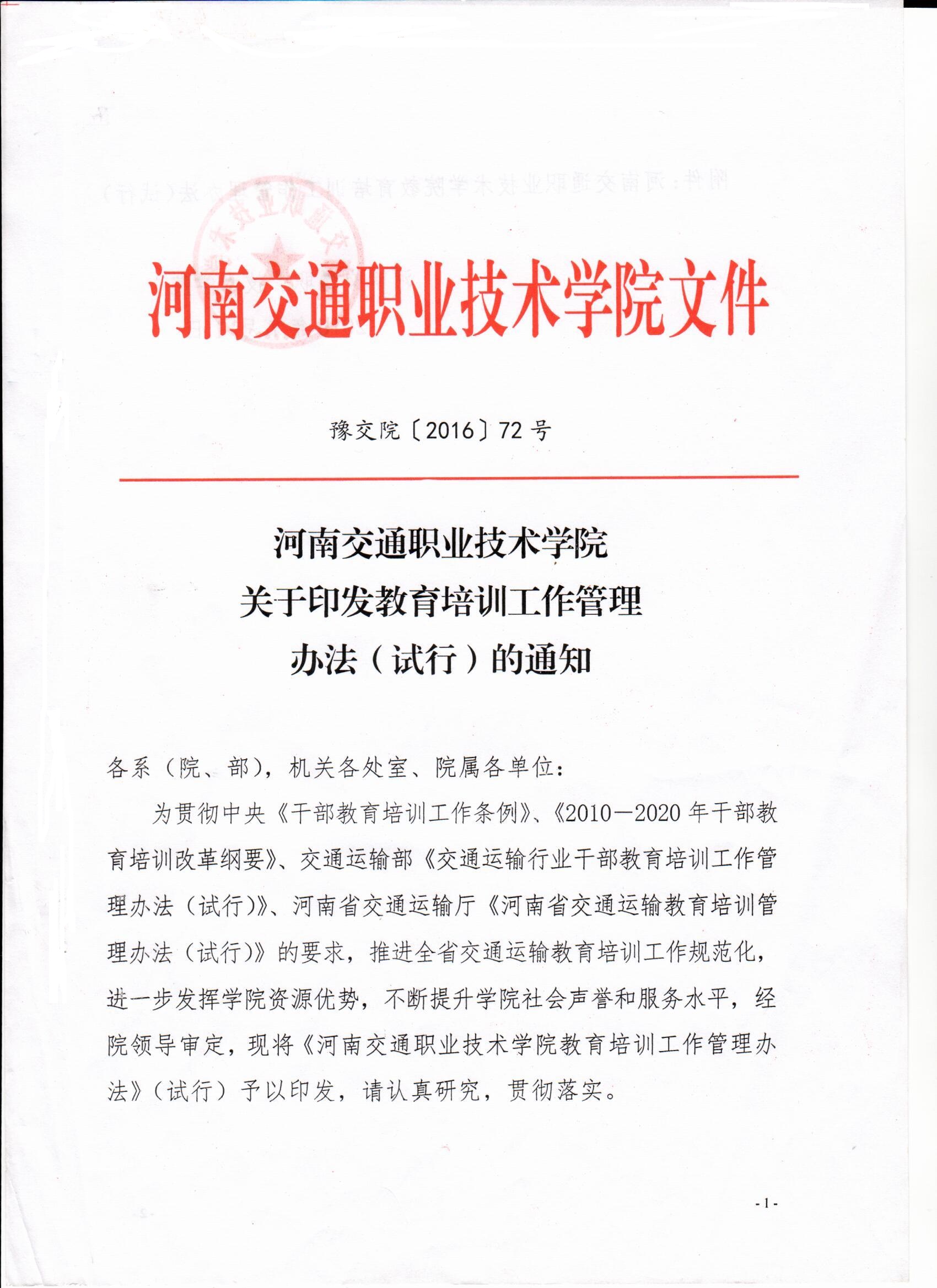 河南交通职业技术学院关于印发教育培训工作管理办法(试行)的通知