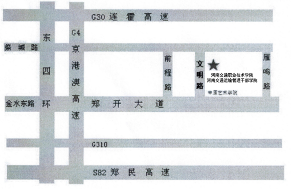 2.郑州高铁东站乘坐地铁1号线到达市体育中心站,出站向北步行约800米,到达河南中医学院站,换乘游570路,向东到达河南交通职业技术学院站即到;